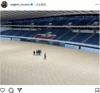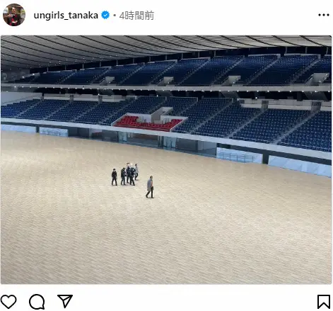 1メートル88と長身の田中が撮影クルーとともにぽつんと小さく写っており「すこぶるアガるビルで代々木第一体育館に入らせて貰った時の写真!巨大人間田中もちっぽけにみえます!」と、体育館の広大さを表した1枚を紹介した。
