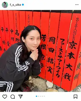 車折神社は芸能人やその関係者によって奉納された約4000枚もの朱塗りの玉垣が社殿を囲んでおり、ウイカは自身の玉垣を見に行ったことを報告。昨年6月以来の訪問となり、「直接見に行けてなかったのでやっと!」と念願のお詣りだったことを明かした。