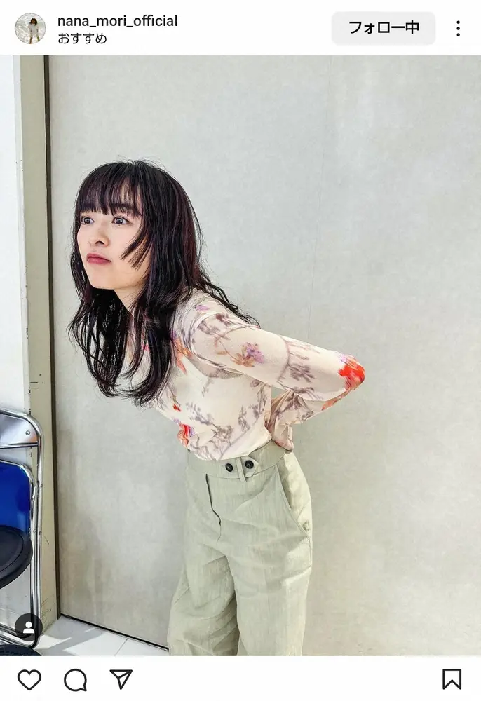 「四月になれば彼女は 取材オフショット」とコメント。姫カットのヘアアレンジで花柄のトップスにパンツを合わせた森の姿を掲載した。