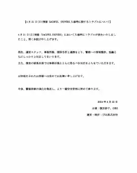 また「4月21日(日)開催SACOFES. UNIVERS入場時に関するトラブルについて」と題する文書を発表。「4月21日(日)開催『SACOFES.UNIVERS』において入場時にトラブルが発生いたしましたこと、深くお詫び申し上げます。現在、運営スタッフ、事務所様、関係各所と連携をとり、警察への情報提供、協議ともにしっかりと対応してまいります」と謝罪した。