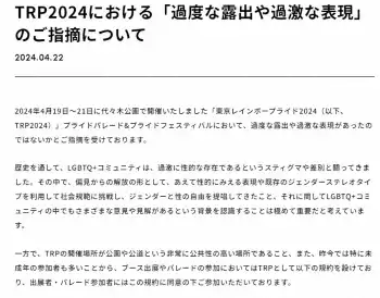 2024年4月19日~21日に代々木公園で開催いたしました「東京レインボープライド2024(以下、TRP2024)」プライドパレード&プライドフェスティバルにおいて、過度な露出や過激な表現があったのではないかとご指摘を受けております。