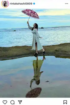 高橋と思われるスタイル抜群の美女が海なのか湖なのかわかないきれいな水辺で、白いコート姿でピンクの傘を手にポーズをとっている写真に「まるでウユニ塩湖。ここはどこでしょう?」という言葉を添えて掲載した。