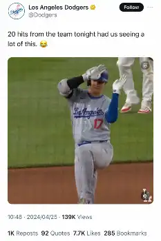 ドジャースが24日(日本時間25日)、自身の公式Xを更新した。大谷翔平投手(29)の試合中のパフォーマンス動画を公開し、ファンから反響を呼んでいる。