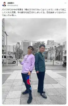 元お笑いコンビ「和牛」の水田信二(44)が25日までに、自身のX(旧ツイッター)を更新。お笑いタレントのバイク川崎バイク(44)との写真が話題を呼んだ。