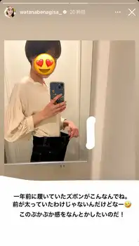 また「1年前に履いていたズボンがこんなんでね」と記し、鏡の前でジーンズを履いた自撮りショットをアップ。ウエストにこぶし1つ入りそうな大きめのジーンズに「前が太っていたわけじゃないんだけどなーこのぶかぶか感をなんとかしたいのだ!」とつづった。