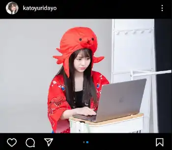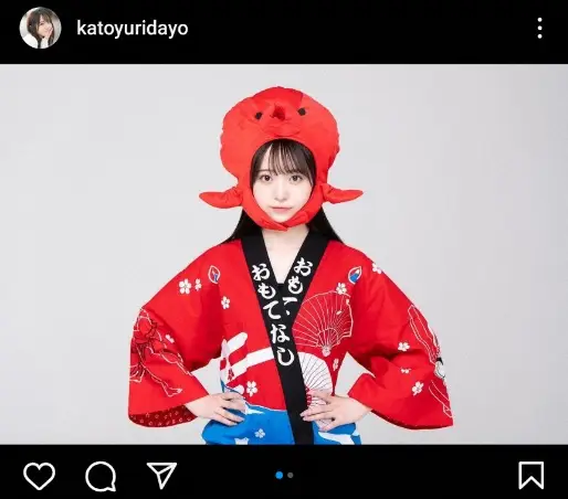 「お知らせ かとゆりさんたこ焼き屋さんに就職します」とつづり、タコの被り物に「おもてなし」の文字が入った法被姿の写真をアップ。続けて「イベント詳細 5/10(金)17時~20時 関西風たこ焼き たごころさんにて1日店長イベントをします!この日はかとゆりのお誕生日 当日はオリジナルメニュー、グッズなどなど準備してますので沢山の人で溢れかえらせましょう チェキも撮れるので是非お越しください(予約制ではないのでお待たせしてしまう場合がございます)」とアピールした。