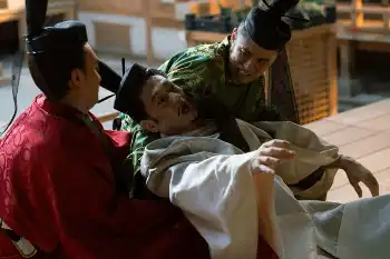 道隆の病状は悪化し、足元もおぼつかない。御簾をめくり上げ、一条天皇に「お上!伊周を、関白に!」。周囲の者に制止されるほど、狂気が宿った。