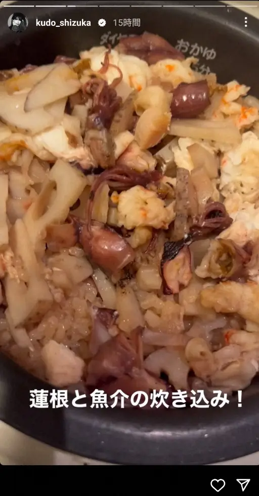 工藤静香 おこげ付きの炊き込みご飯公開し「蓮根と魚介の炊き込み!」「見て~お焦げ」「おいしそう」