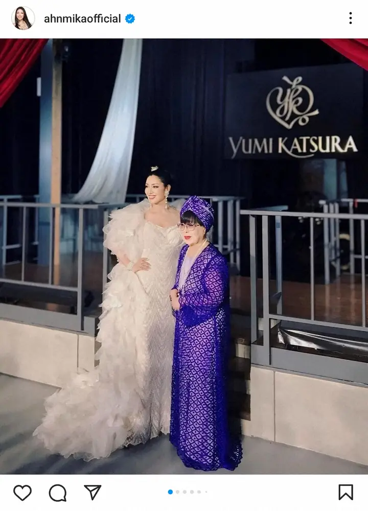 また「日本の伝統美や技術を継承し、思いもよらない新素材の発想力で誕生する桂由美さんが手掛ける衣装やドレスたちは、どれも唯一無二の芸術作品。なのに着用すると動きやすく、何より着る人をとても美しく見せてくれて、自信を増大させ輝かせてくれる。何度も桂由美さんの魔法にかかりました」と振り返った。