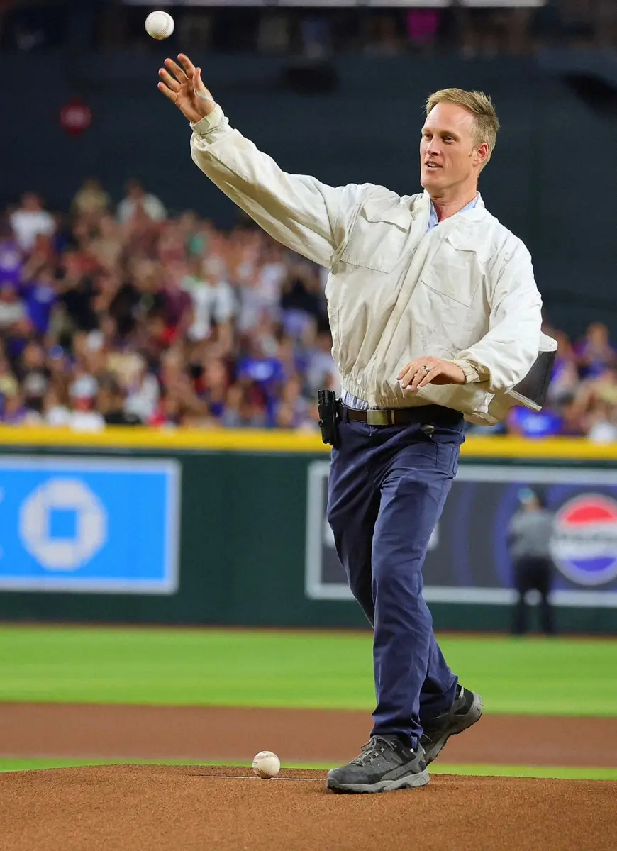 始球式を務めるハチ駆除業者のマット・ヒルトンさん(撮影・光山 貴大)