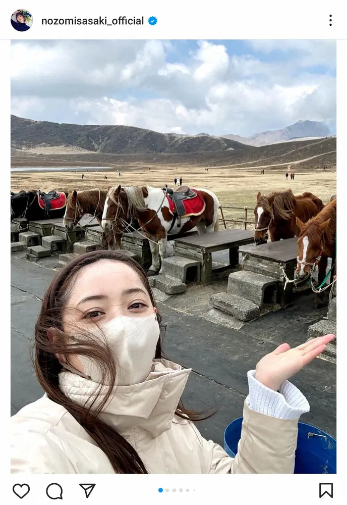 佐々木は「熊本旅記録」とのタイトルで「久々の熊本!」と投稿。「子供と一緒に阿蘇山にて乗馬体験 係の方が案内してくださり、のんちゃんという名前のお馬さんに乗りました!」と馬との写真を掲載した。