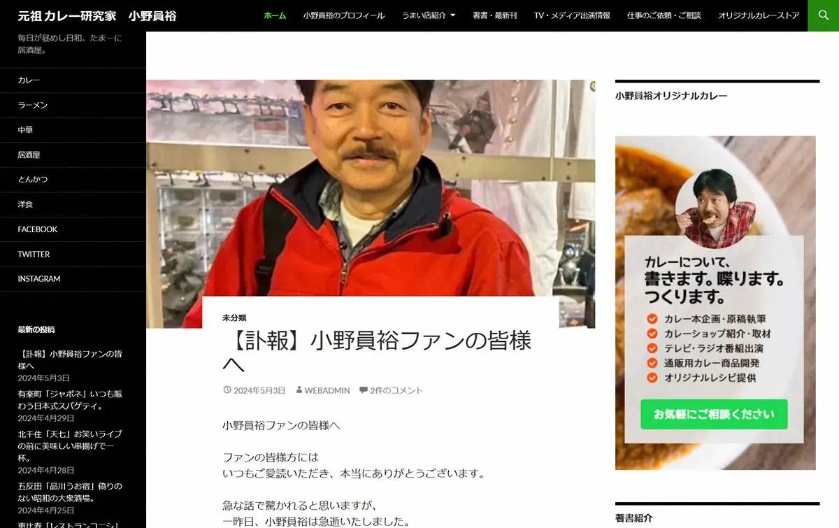 小野員裕さん死去 Photo by スポニチ カレー研究家・小野員裕さん死去していた ブログで発表「心筋梗塞での急… ギャラリーで見る この記事のフォト 2024年05月04日の画像一覧 もっと見る 2024年05月04日の画像をもっと見る