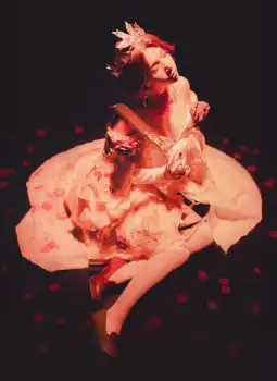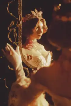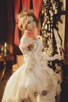 血祭り衣装は、首元に深紅の飾りのあるネックレスが特徴的。肩が大きく開いたオフショルダーのドレスは、ネックレスと対比するようなクリーム色。全体的に上品で幻想的な雰囲気が醸し出されており、光と影のバランスが計算された構図は、まるで絵画のような趣さえ感じさせる。