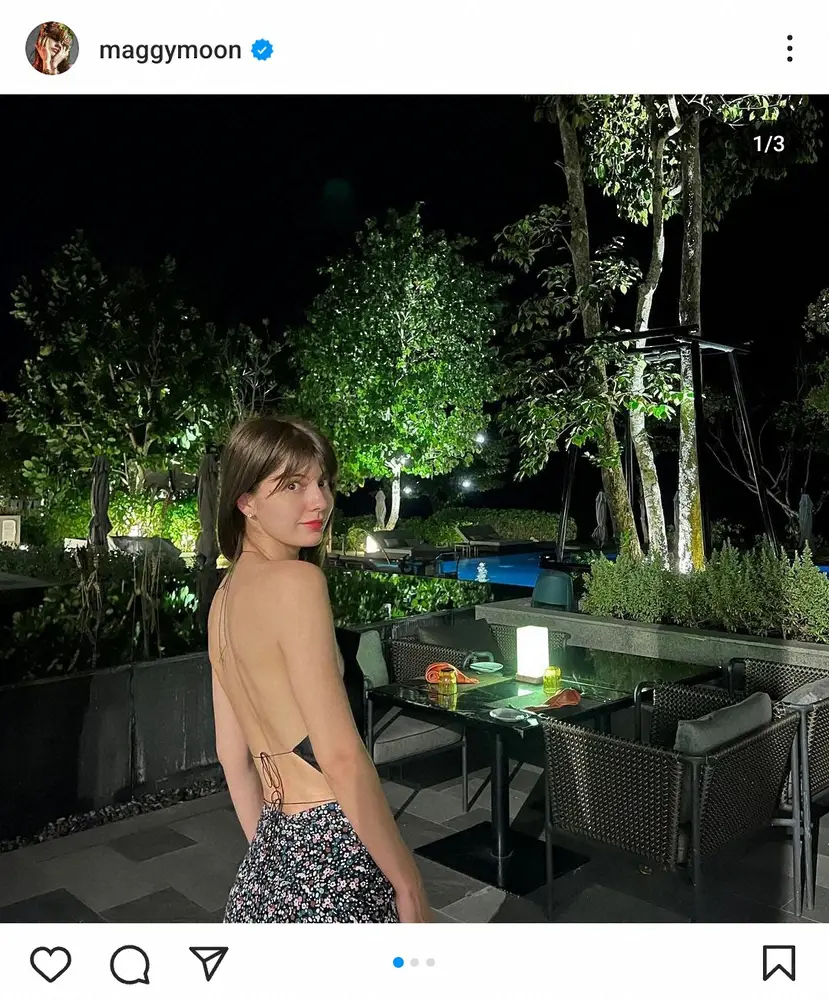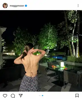 マギーは「お気に入りトップス」とコメント。背中はほぼストラップのみの大胆なデザインのトップス姿を公開した。