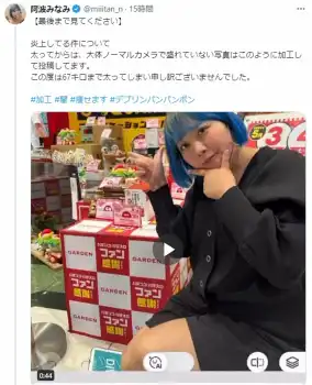これらの声を受け、阿波は「炎上してる件について」と書き出し、写真の加工について「太ってからは、大体ノーマルカメラで盛れていない写真はこのように加工して投稿してます」と、加工の一部始終を公開。「この度は67キロまで太ってしまい申し訳ございませんでした。#加工 #闇 #痩せます #デブリンバンバンボン」と、茶目っ気たっぷりにファンへ呼びかけた。