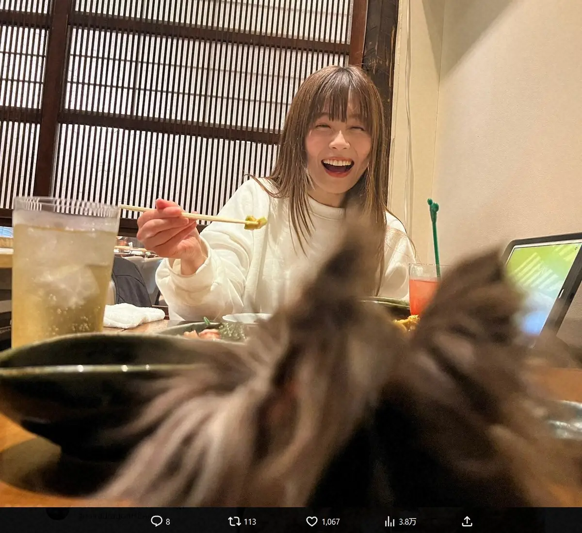 「いつもご飯に行ってくれて有難う。2枚目は、影ちゃんが撮ってくれたチコちゃんとの2ショット」と影山との密着2ショットやカメラの前を横切る影山の愛犬との写真などを投稿した。