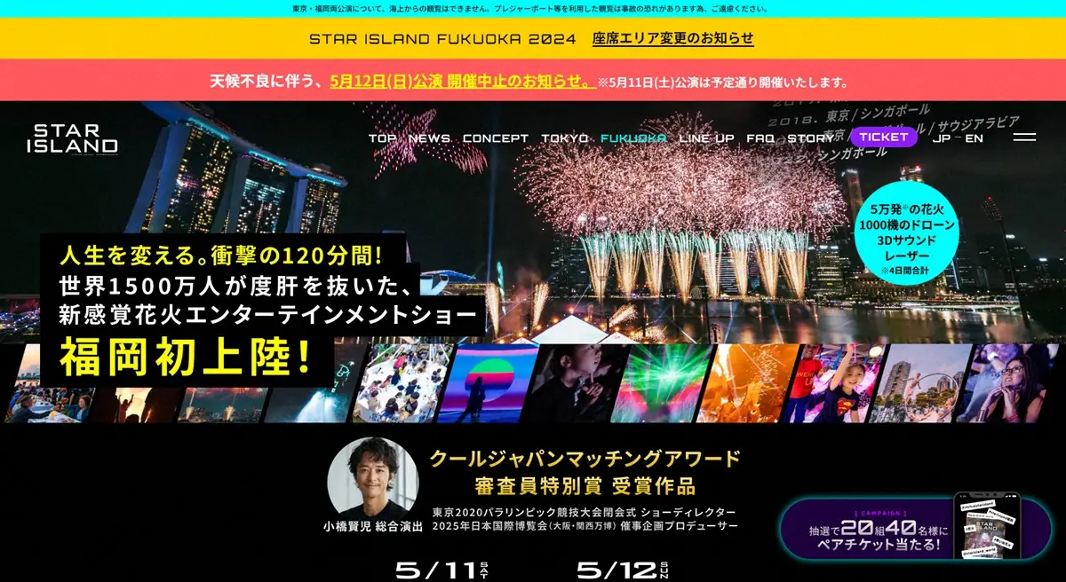 「STAR ISLAND FUKUOKA」に関して、5月12日(日)は荒天が予想されており、演出の大部分を担う花火とドローン飛行への影響が懸念されております。現状を鑑みて、5月12日(日)の公演は【中止】とさせていただく運びとなりました。直前のご案内になりますとお客様にご迷惑をおかけしてしまうことから、実行委員会内で協議・検討した結果、早めの判断とさせていただきました。急なお知らせとなり、ご迷惑をおかけしますこと、深くお詫び申し上げます。
