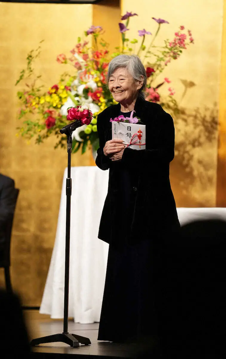 受賞のスピーチを促されると、1人で元気にマイクの前に立ち「このような素晴らしい賞を頂いて、今、倒れそうでした」と会場の笑いを誘いながら「これからも歳だと思わないようにして突き進んでまいります。本当にありがとうございました!」と元気に宣言した。