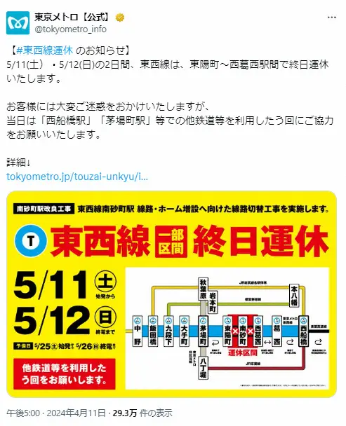東京メトロ 11、12日に東西線・東陽町-西葛西駅間終日運休 駅の大量ポスターに「執念」「圧やばい」