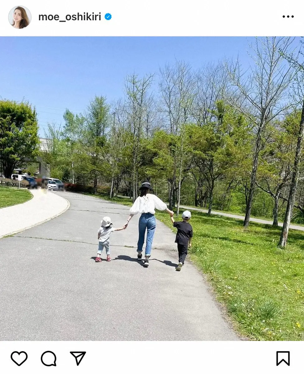 「先日、お出かけ先にて」と長男、長女と手をつないで歩く3ショットを掲載。「青空が気持ちよかった。お友達とも会えて、夜まで親子で一緒に遊べて楽しい一日でした」と充実した休日を振り返った。