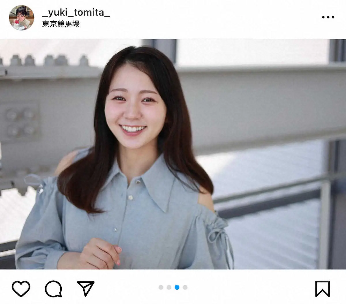 テレビ東京の冨田有紀アナウンサー(26)が11日までに自身のインスタグラムを更新。レギュラー出演している「ウイニング競馬」で披露した青の肩出しワンピースショットを公開した。