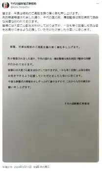 その上で「皆様には大変ご心配をおかけしておりますが、一日も早く回復し元気な姿をお見せできるよう応援していただけたけましたら幸いに存じます」と投稿した。
