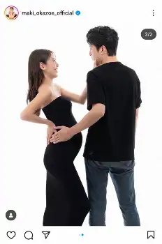 岡副は36週の時に撮ったものとし、体のラインがわかる黒のドレス姿で、ふっくらとしたお腹に愛おしそうに手を当てる写真や、夫でレーシングドライバーの蒲生尚弥との2ショットを公開。