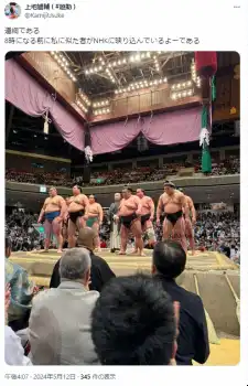 同じく国技館で行われた1月の初場所では、連日著名人の相撲中継映り込みが大きな話題になったが、夏場所も著名人が映り込んでネット上の話題となった。この日はタレントで歌手の上地雄輔が春場所に続いて砂かぶり席で観戦していている姿がキャッチされた。