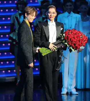 本公演終了後には約30分の「サヨナラショー」が行われた。代表作ともなった「グレート・ギャツビー」の主題歌「朝日の昇る前に」で幕を開け、2021年に福岡・博多座で上演したトップお披露目公演「川霧の橋」、美しさが際立った「ダル・レークの恋」の「まことの愛」と続々披露。同時に退団するトップ娘役の海乃美月(うみの・みつき)とともに、大劇場でのお披露目公演「今夜、ロマンス劇場で」でデュエットを披露し客席を魅了した。