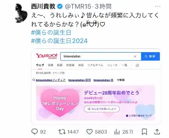 5月13日は自身のソロプロジェクト「T.M.Revolution」デビュー28周年。Yahoo!の検索エンジンに「tmrevolution」と入力し、それを祝うメッセージとハートが画面に広がったことを報告。その画面を添付し、「え~、うれしみぃ。皆んなが頻繁に入力してくれてるからかな?」と喜びをつづり、ハッシュタグで「僕らの誕生日」「僕らの誕生日2024」と添えた。