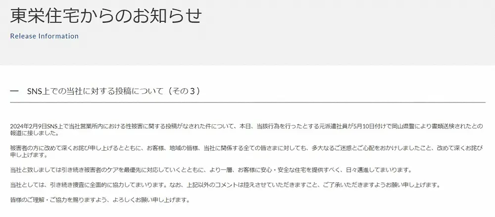 東栄住宅 同僚の飲料に体液入れた疑い 東栄住宅が謝罪 元派遣社員20代男性が書類… ギャラリーで見る この記事のフォト 2024年05月14日の画像一覧 もっと見る 2024年05月14日の画像をもっと見る