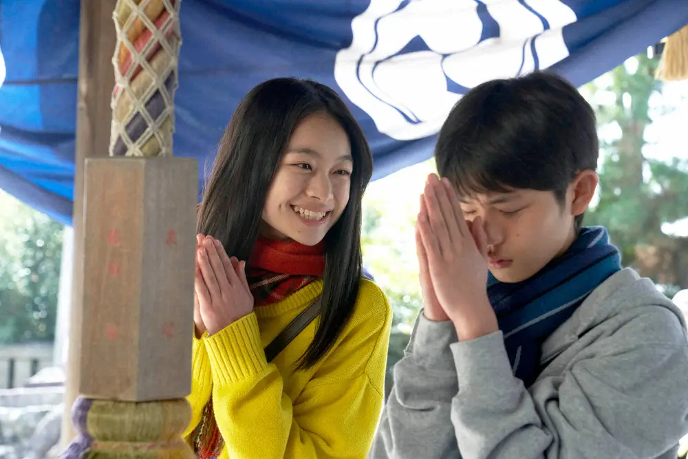 「からかい上手の高木さん」神社でお参りする高木さん(月島琉衣)と西片(黒川想矢)(C)TBS