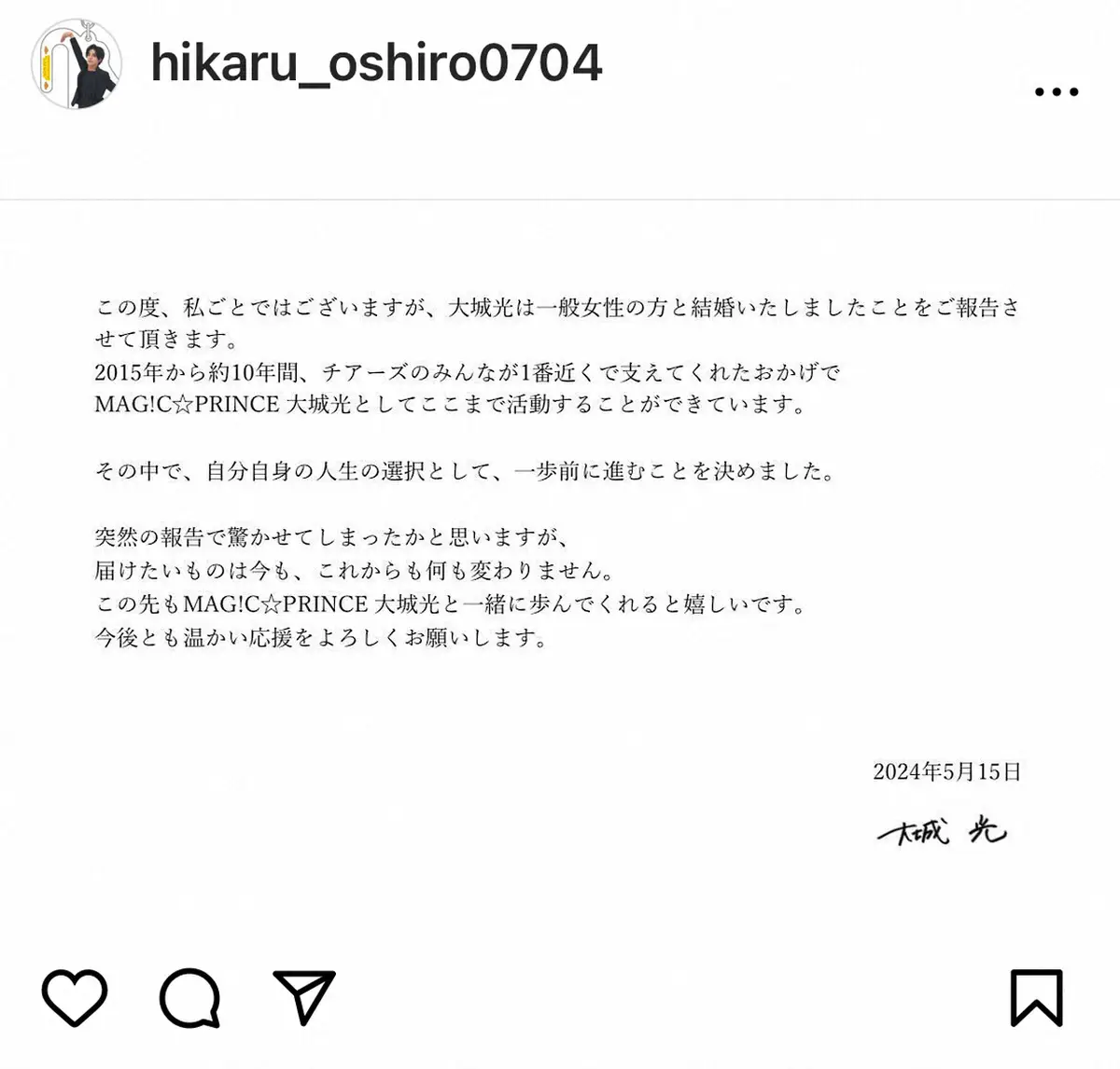 「MAG!C☆PRINCE」の大城光 Photo by 提供写真 マジプリ大城光 一般女性との結婚を発表「自分自身の人生の選択として、 … ギャラリーで見る この記事のフォト 2024年05月15日の画像一覧 もっと見る 2024年05月15日の画像をもっと見る