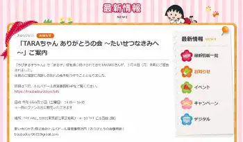 アニメ公式は「『ちびまる子ちゃん』で「まる子」役を演じ続けられてきたTARAKOさんが、3月4日(月)未明にご逝去されました。生前のご厚誼に深謝しお別れの会を執り行うこととなりました」と報告。6月15日の午後2時から4時で東京・江東区のTFT HALL 1000で執り行う。「一般のファンの方に献花いただきます」と説明した。