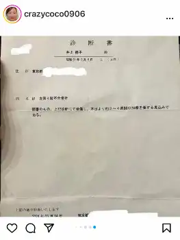 診断書も公表。本名の「井上徳子」名義で、診断名は「左第4趾不全骨折」とし「頭書のもの、上記診断にて受傷し、本日より約2~4週間の加療を要する見込みである」と記されている。