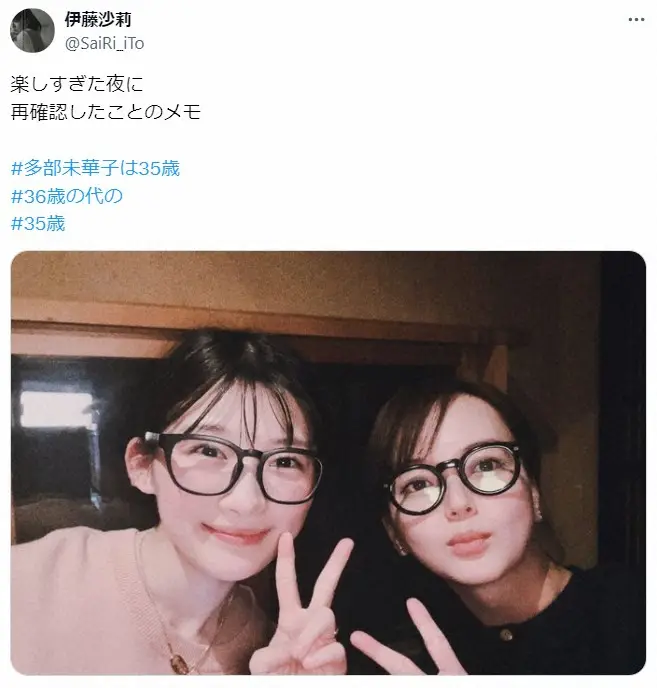 「楽しすぎた夜に 再確認したことのメモ」とつづり、めがね姿での2ショットを投稿した伊藤。伊藤の隣には、同じくめがね姿の女優・多部未華子の姿があった。