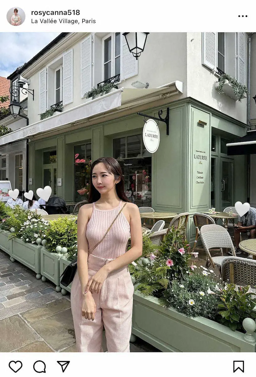 そして次の投稿ではアウトレットでお買い物したことを報告した上で「買う予定じゃなかったけど、安かったからロエベのバック買ってしまった。laduree のマカロン無料でもらえたから良しとしましょう笑」とピンクニットタンクトップ姿での写真を投稿した。