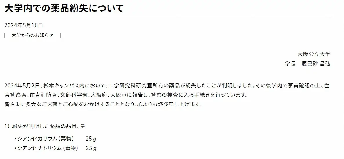 同大学は16日、青酸カリ25グラムと青酸ソーダ(シアン化ナトリウム)25グラムの、合わせて50グラムを紛失したと発表した。最大250人分の致死量にあたるとも言われ、衝撃のニュースとして世間に伝わった。