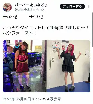 あいなぷぅは公式サイトによれば身長は1メートル52.5。この日「こっそりダイエットして10kg痩せました~!ベジファースト!」と報告。野菜を最初に食べるというダイエット法で10キロ落としたという。