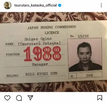 この日の投稿では「1988年取得 ボクシングマネージャーライセンス 懐かしい~」と当時の顔写真付きの登録証をアップ。名前の欄には「Shigeo Ogino(Tsurutaro Kataoka)」と本名「荻野繁雄」が記されている。