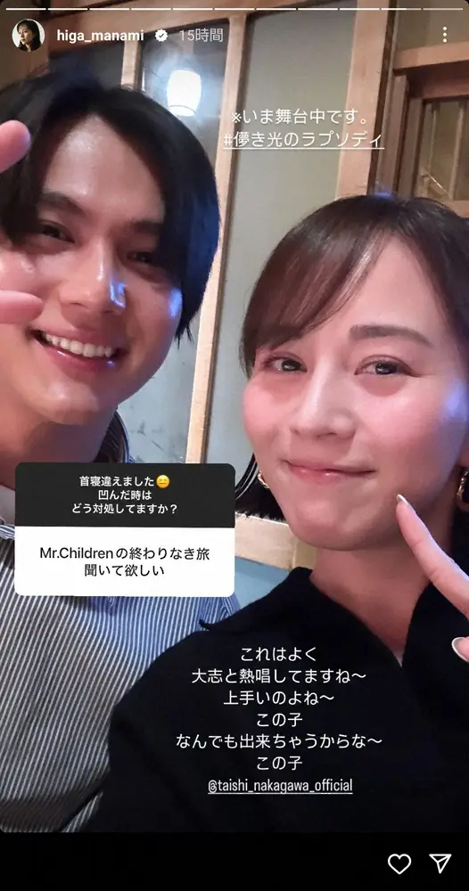 これに対し比嘉は「これはよく大志と熱唱してますね~」と返答。「上手いのよね~この子 なんでも出来ちゃうからな~この子」と、俳優の中川大志のアカウントを添え、ツーショット写真を掲載した。