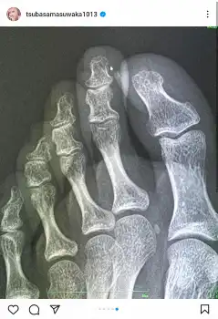 「あまりの痛さに『まさかまた骨折れたのか、、!』と次の日病院に行ってレントゲン撮ったんだけど、綺麗にくっついてました笑」と続け、レントゲン写真を公開した。