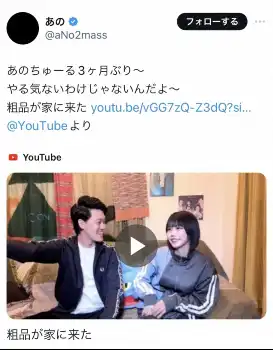 「あのちゃん」こと歌手・あの(年齢非公表)が21日までに自身のYouTubeチャンネルを更新。お笑いコンビ「霜降り明星」の粗品(31)がゲスト出演し、あのちゃんの部屋の印象について語る場面があった。