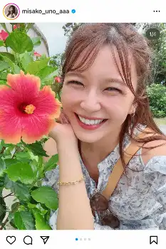 「1泊2日でうの旅 in沖縄行ってきたよ」と真っ赤なハイビスカスの横ではにかむショットとともに報告。
