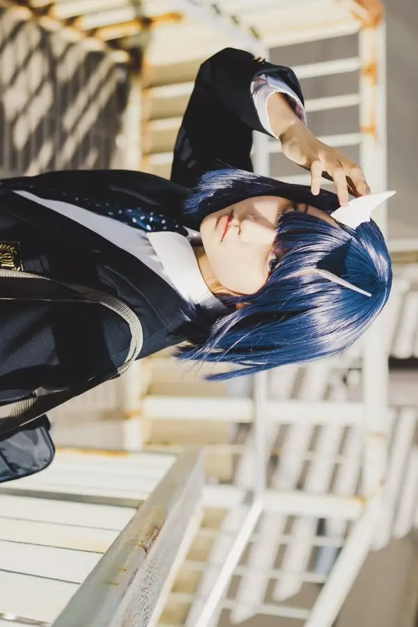 ウィッグは3次元よりを意識し、風が吹いた時に綺麗になびくよう毛量を少なめにし、固めすぎないようにしました。衣装は実際に使用していた学生服をリメイクし、キャラに近づけました。またこの画像には写っていませんが、スカートは1から母に作っていただきました。いい風が吹いた瞬間を綺麗に撮っていただいたお気に入りの1枚です」