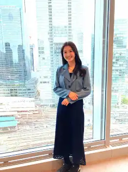 国内屈指のオフィス街がのぞめる大きな窓を背に、福田はパソコンに向かっていた。ダークな色のワンピースにブルーのジャケット、足元はスニーカー。ニューヨーカーを思い起こさせるスタイルですっかり東京・丸の内OL生活になじんだように見える。