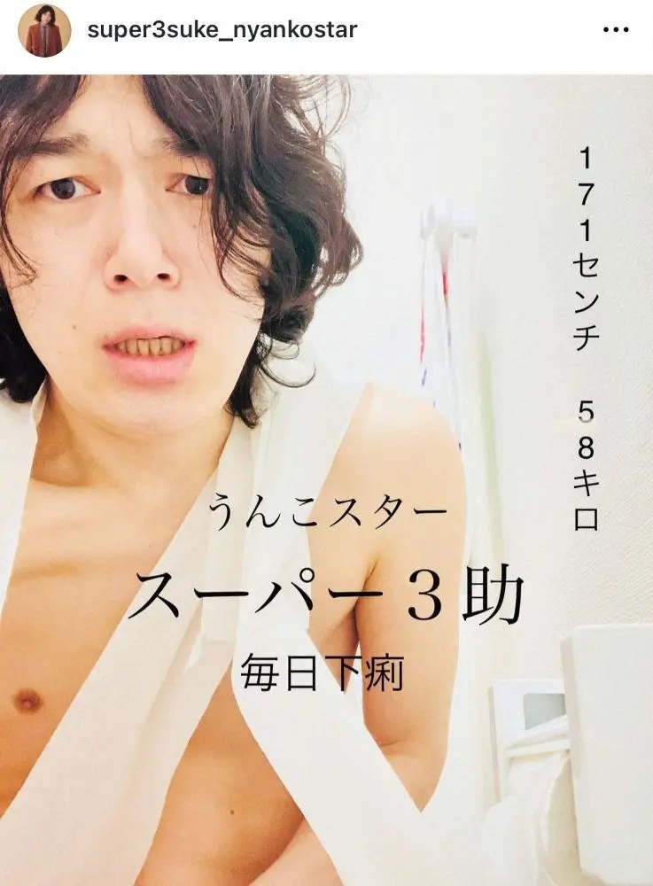 過去に交際し、破局を公表していたスーパー3助は、自身の“セクシーショット”を公開し「171センチ、58キロ」と告白。セクシーショットは、よく見るとトイレットペーパーに包まれたスーパー3助で、「毎日下痢」とつづられており、6月5日開催のにゃんこスター初単独ライブ「飛拳」の宣伝も忘れずに記した。