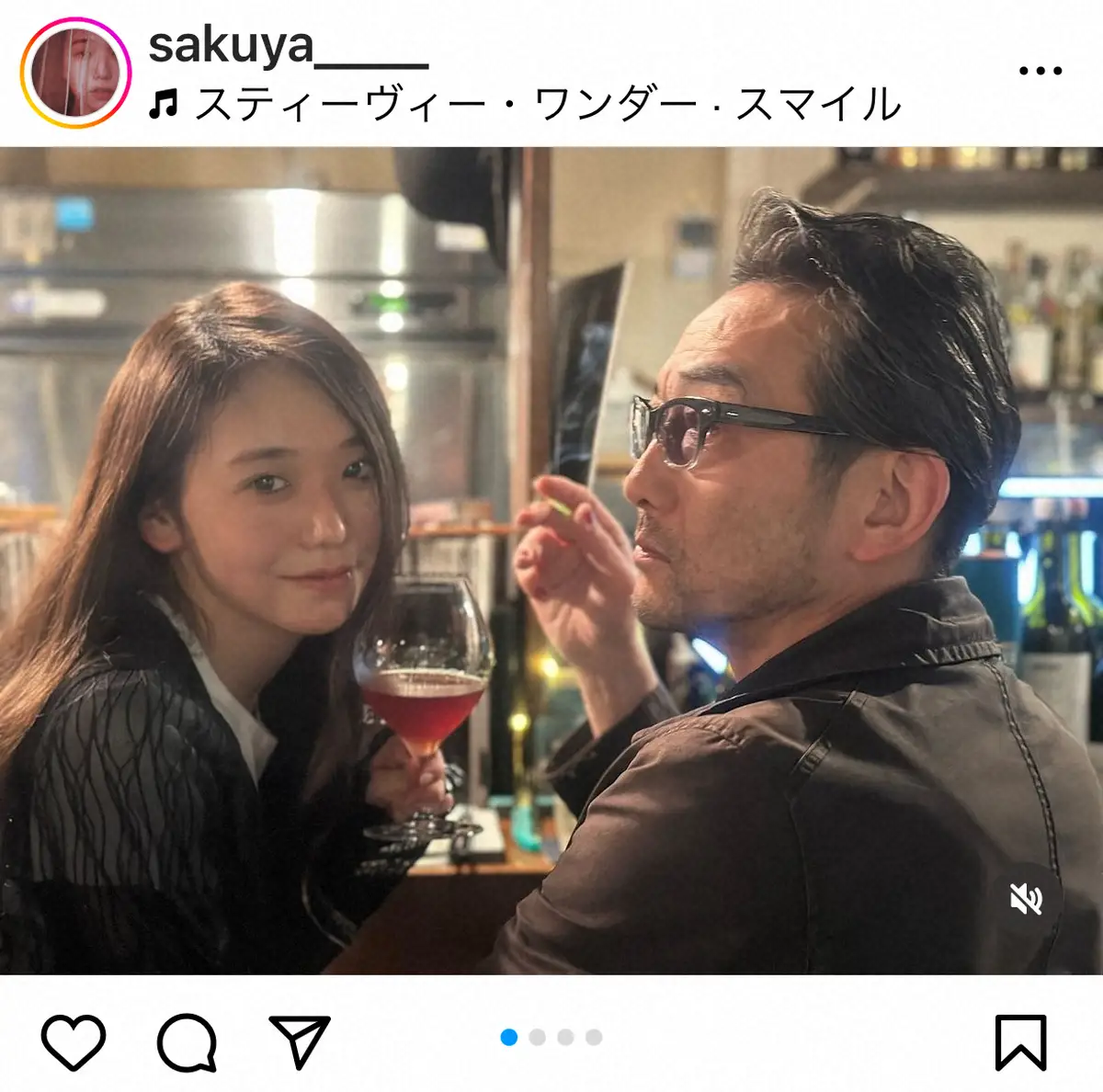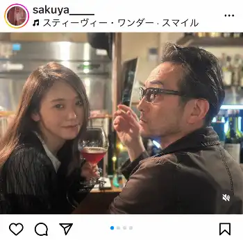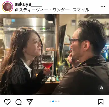 咲耶は「Smile」とのみ記し、写真をアップ。ワイングラスを手に、吹越とお酒を楽しむ様子を捉えた複数枚のショットをアップした。