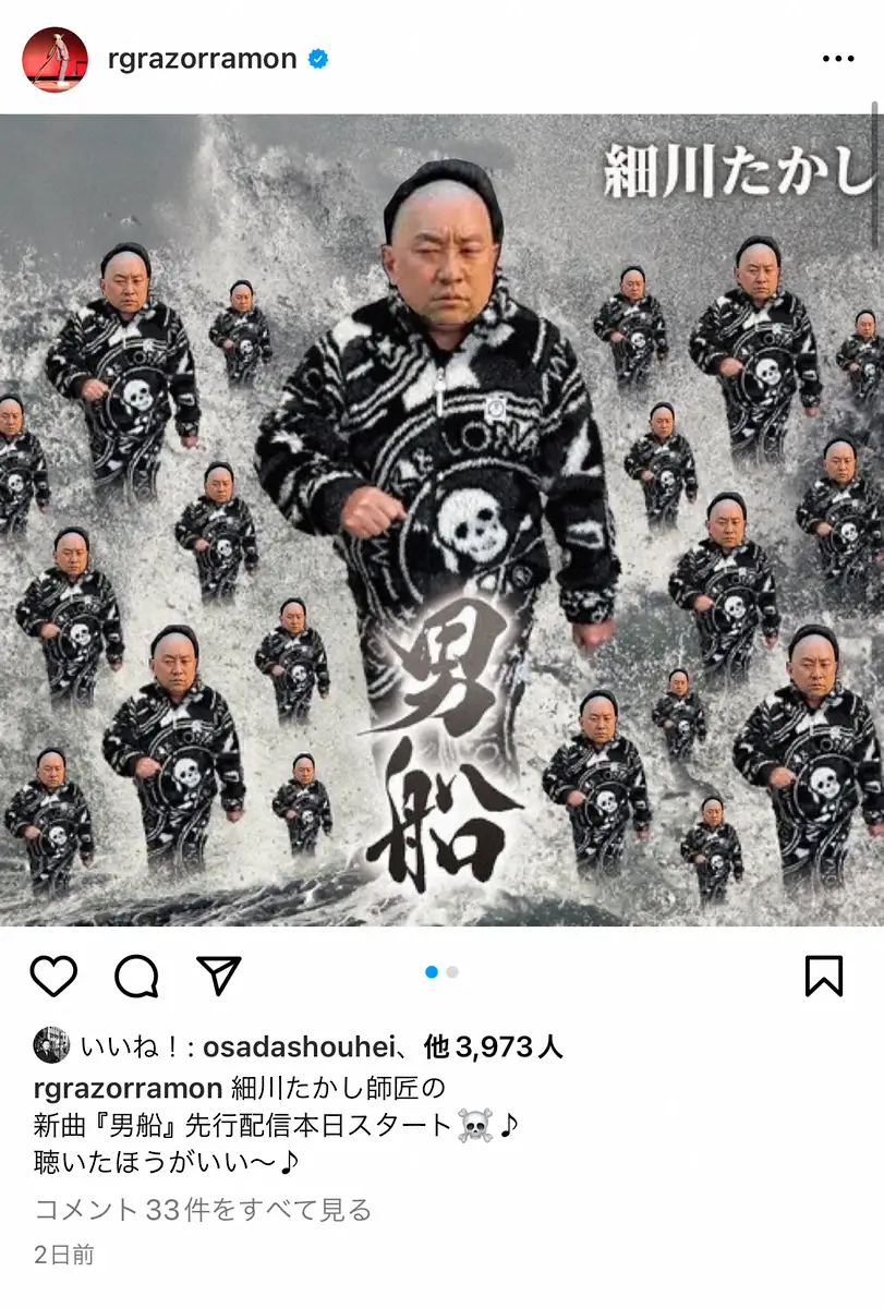これを受け、RGはすぐにインスタグラムを更新。「細川たかし師匠の新曲『男船』先行配信本日スタート 聴いたほうがいい~」というメッセージとともに、「男船」のジャケット写真を完全再現した様子をアップ。