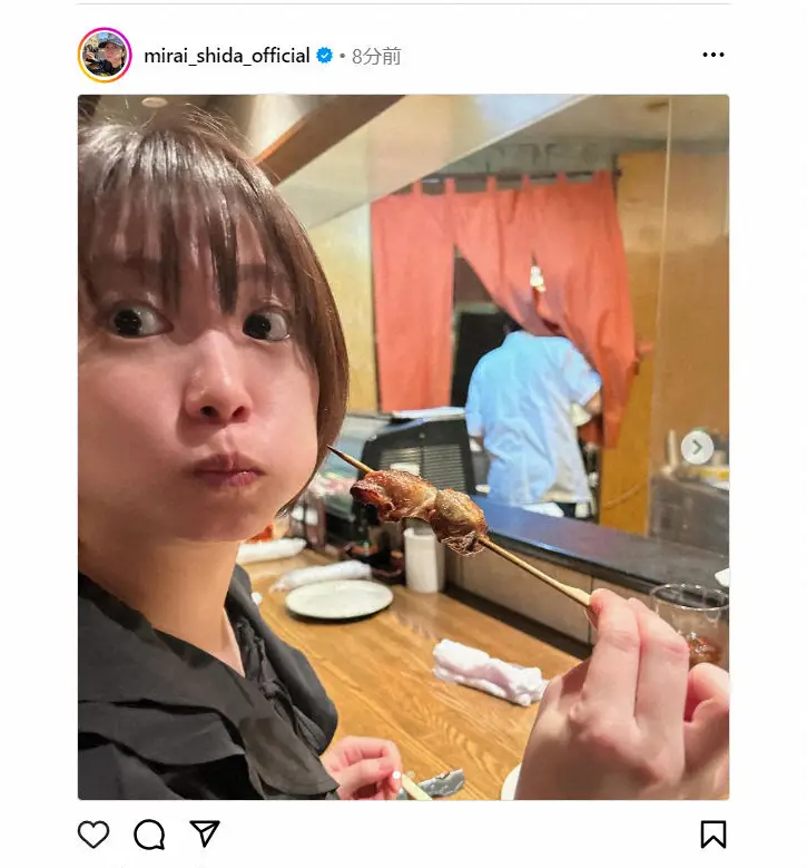 志田は「焼き鳥が美味しかった日」とつづり、口いっぱいに焼き鳥を頬張る自身の写真を投稿した。